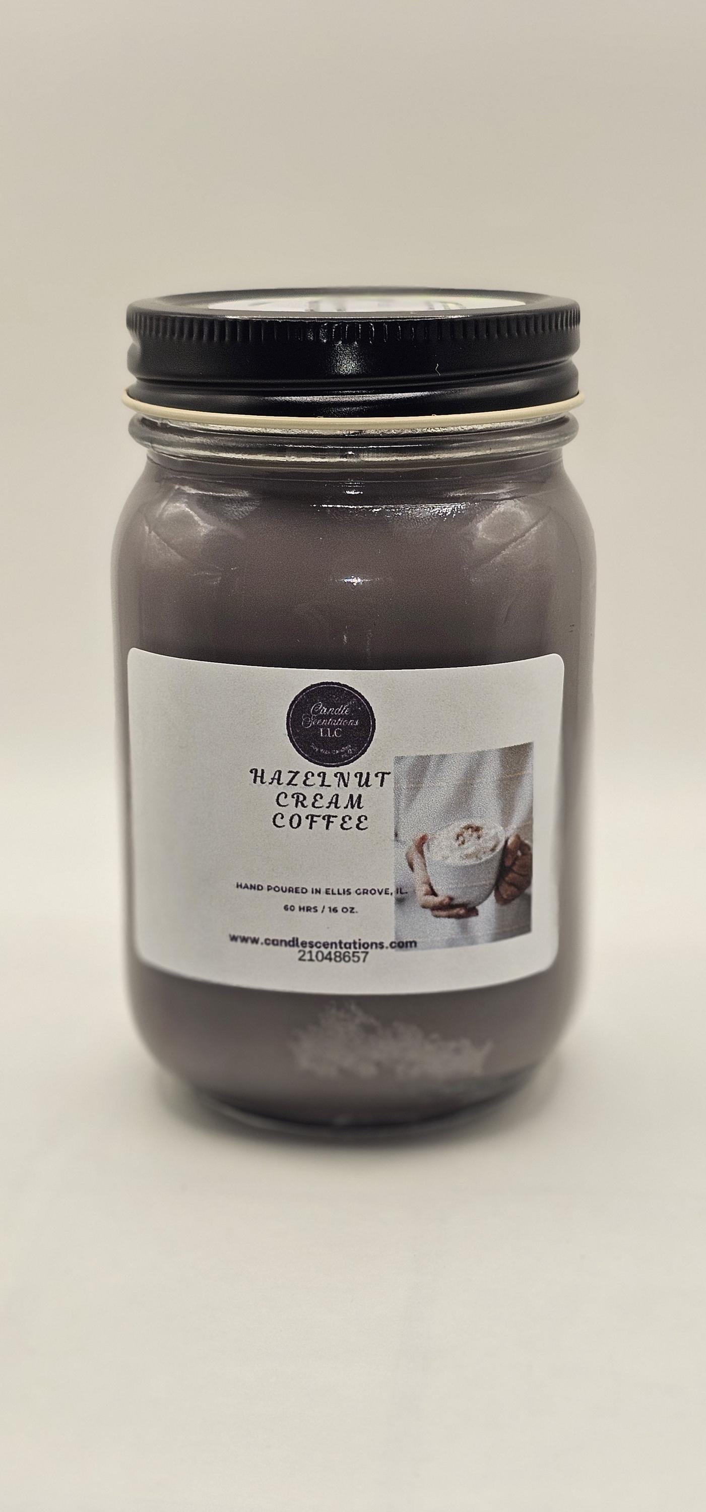 Indulge in the luxurious scent of our Hazelnut Cream Coffee 16 oz. Candle. Our expertly crafted blend of sweet and nutty notes creates the perfect aroma, reminiscent of a freshly brewed cup of creamy coffee. Immerse yourself in the rich scents of Arabica coffee beans, creamy vanilla, and nutty hazelnuts, accented by real whole coffee beans. Elevate your senses with every use.