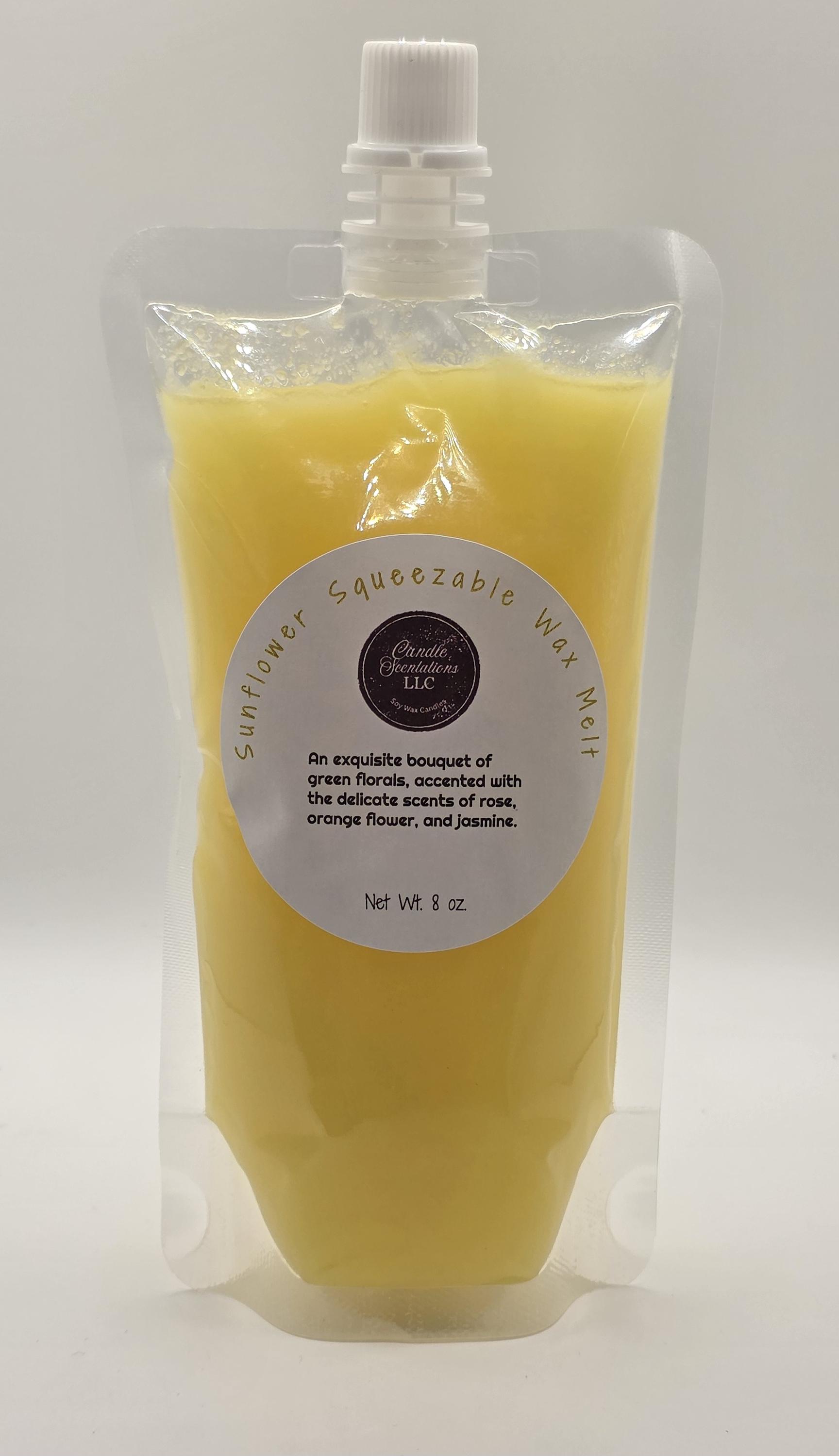 An exquisite bouquet of green florals, accented with the delicate scents of rose, orange flower, and jasmine. Our Sunflower Squeezable Wax Melt, at 8 oz., offers a luxurious and captivating aroma that will elevate any space. Embrace the sweet and refreshing background for a truly indulgent experience.