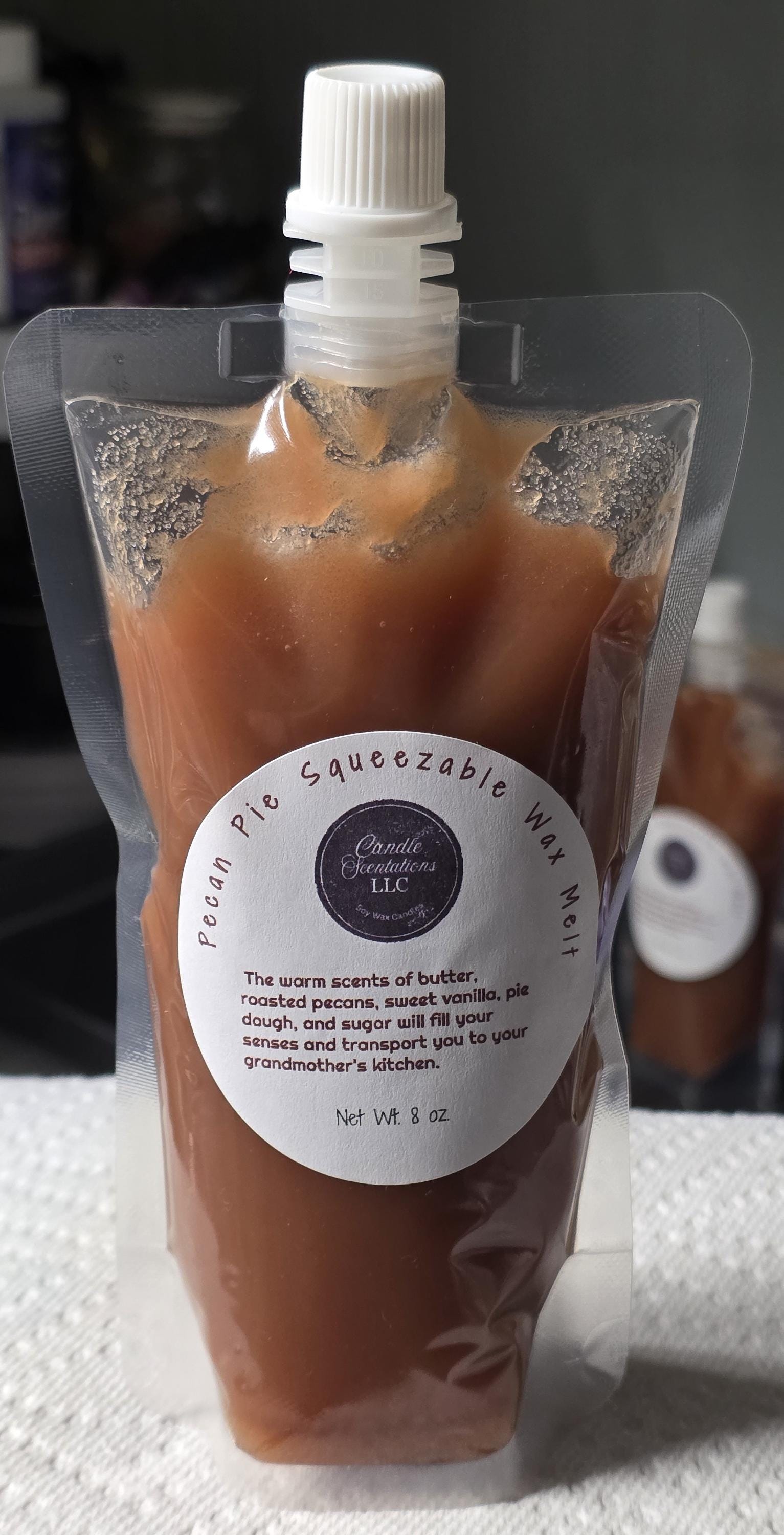 Indulge in the comforts of home with our Pecan Pie Squeezable Wax Melt. The warm scents of butter, roasted pecans, sweet vanilla, pie dough, and sugar will fill your senses and transport you to your grandmother's kitchen. Add a touch of luxury to your home with this fragrant addition.